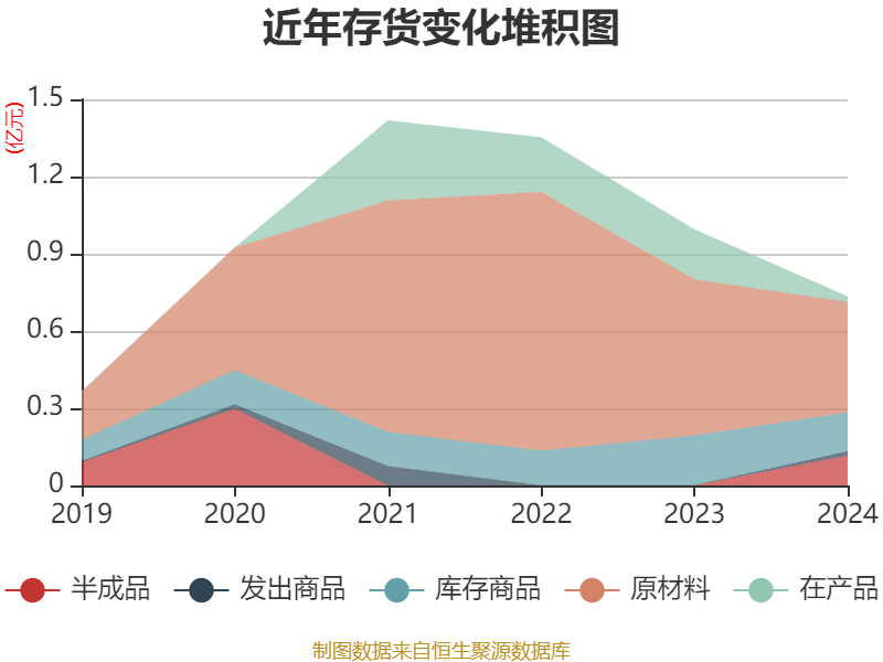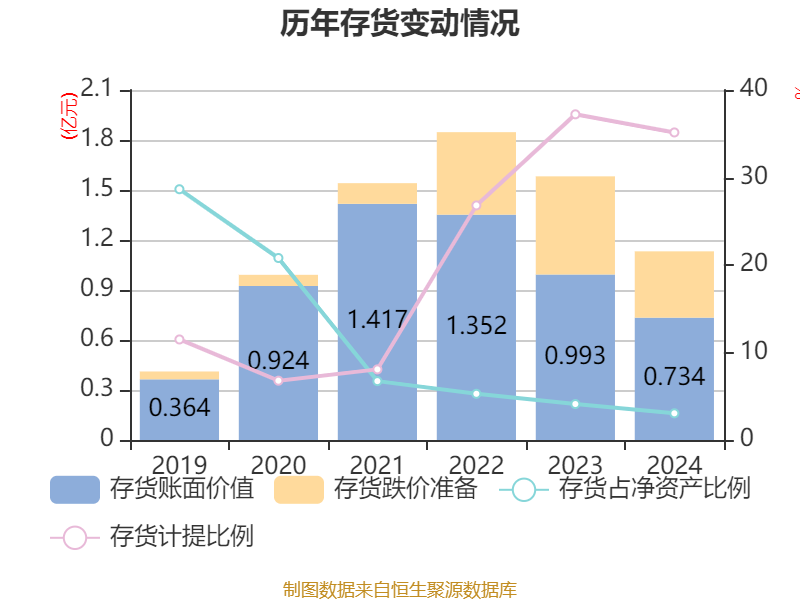 从存货变动来看,截至2024年末,公司存货账面价值为7340.11万元,占净资产的3.05%,较上年末减少2592.29万元。其中,存货跌价准备为3978.33万元,计提比例为35.15%。
