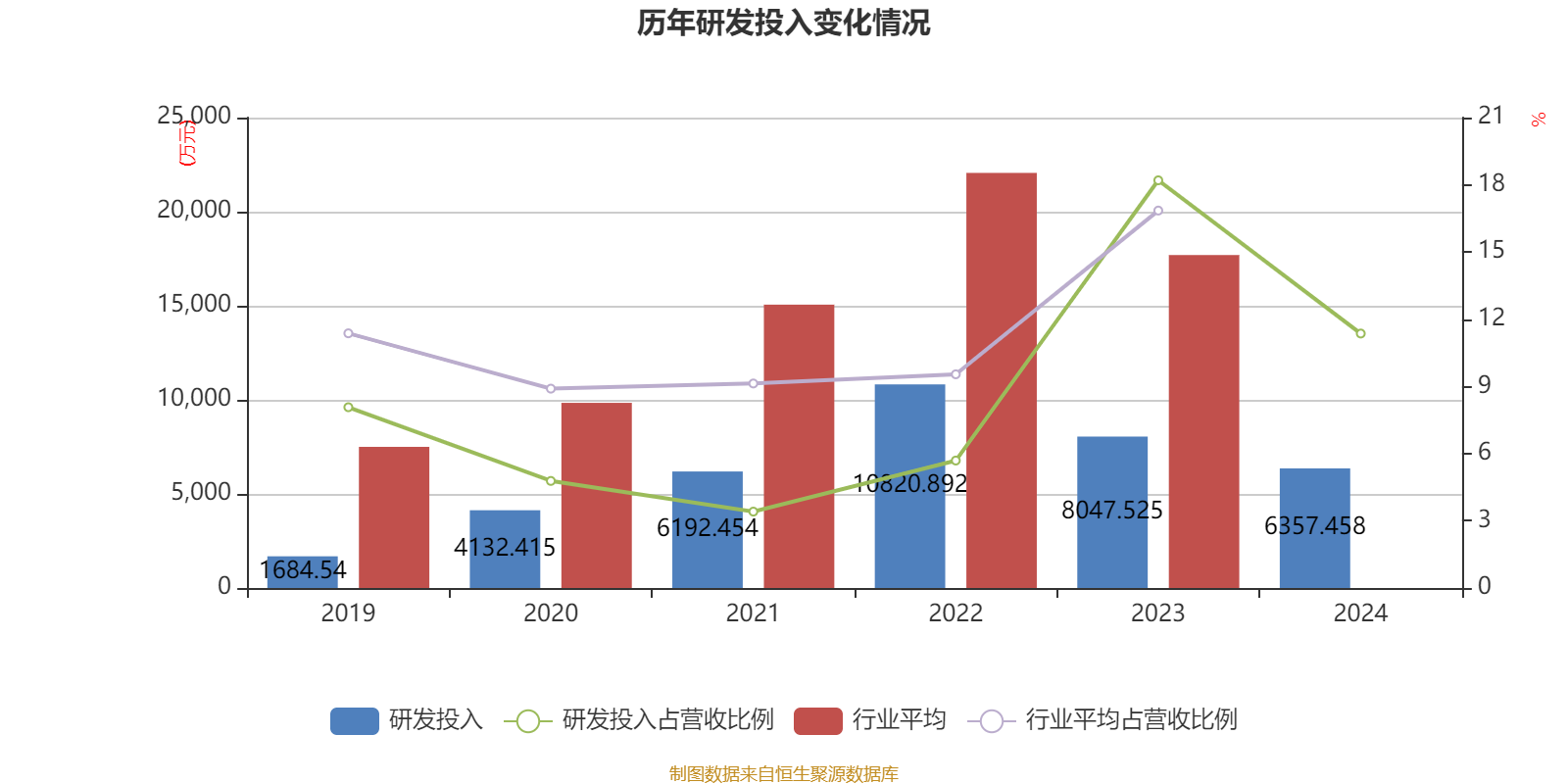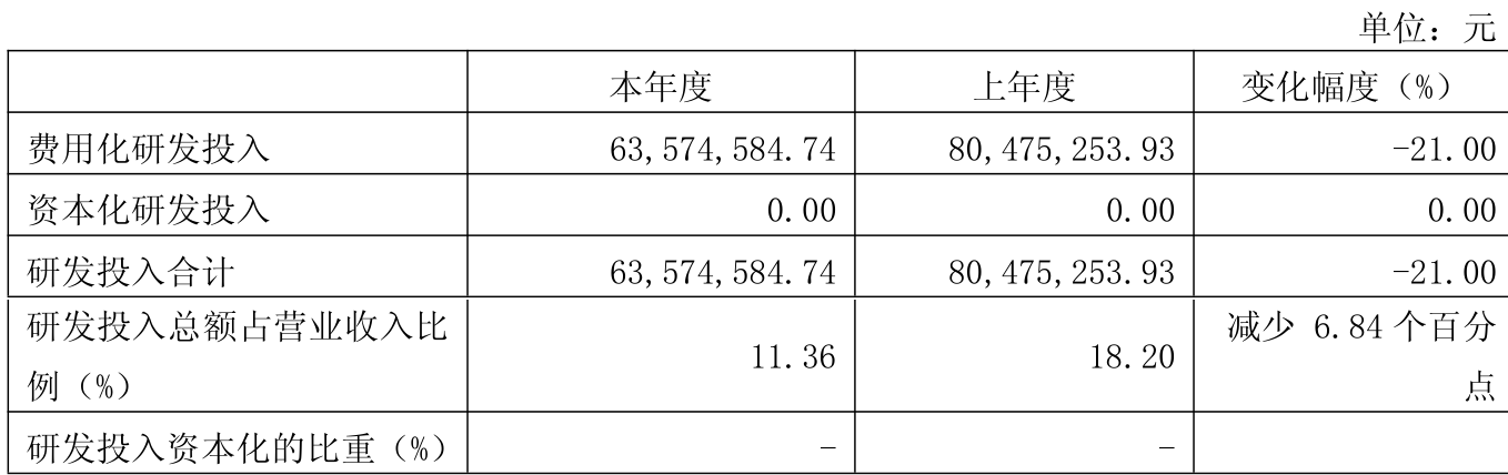 2024年全年,公司研发投入金额为6357.46万元,同比下降21%;研发投入占营业收入比例为11.36%,相比上年同期下降6.84个百分点。