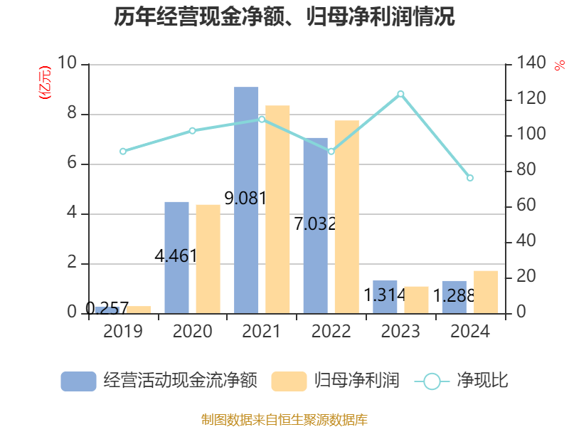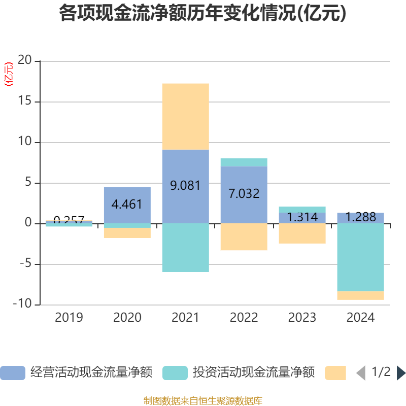 截至2024年,公司经营活动现金流净额为1.29亿元,同比下降1.94%;筹资活动现金流净额-1.05亿元,同比增加1.45亿元;投资活动现金流净额-8.38亿元,上年同期为7436.25万元。