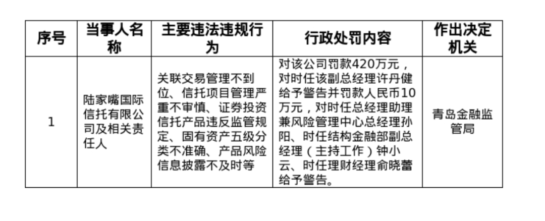 针对上述违法违规行为,青岛监管局对陆家嘴信托罚款420万元,对许丹健警告并处罚款人民币10万元,对孙阳、钟小云、俞晓蕾给予警告。